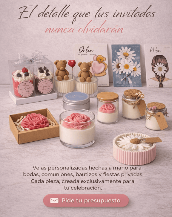 Ya sea para comuniones, bautizos, cumpleaños, bodas, eventos corporativos o fiestas privadas 🎉💍, tendrás opciones perfectas como velas en vaso, mini latas, centros florales y detalles para invitados 🎁. Todo hecho a mano con mimo, cuidando la estética y ofreciendo una presentación lista para entregar.