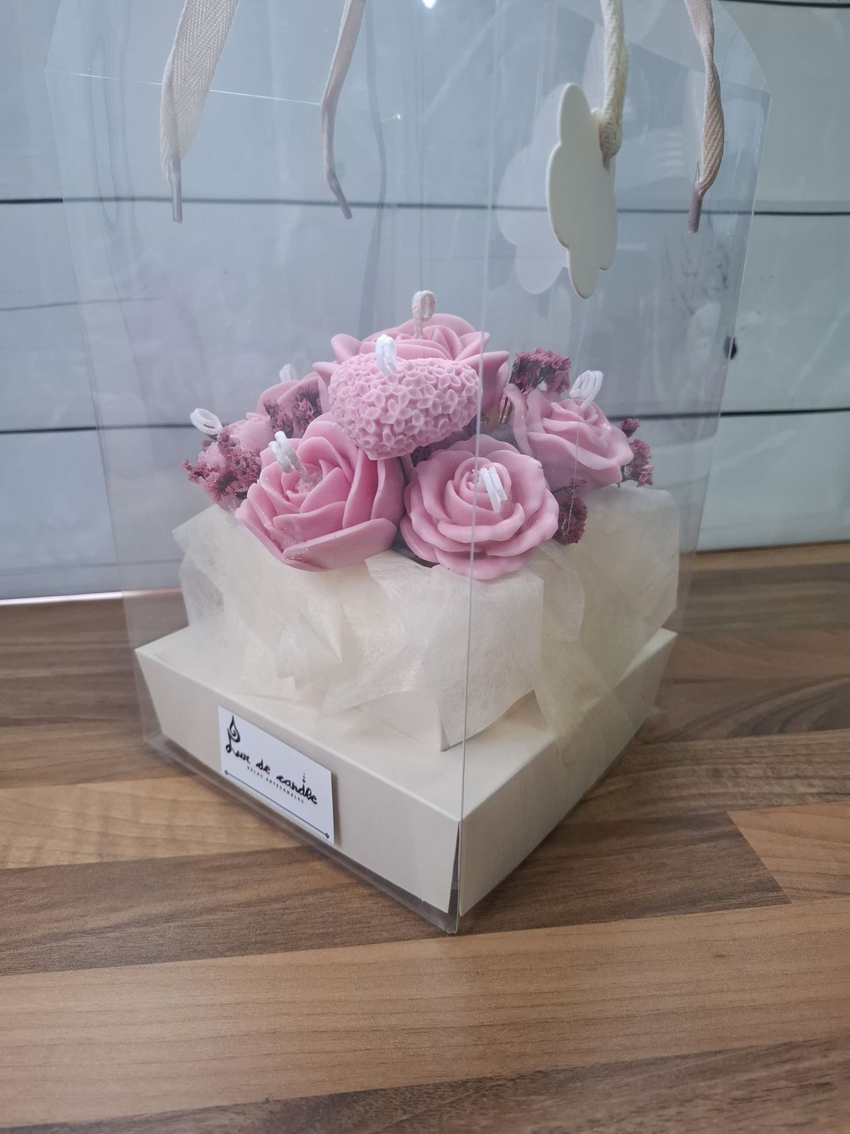 Un detalle encantador para regalar o decorar: ramo artesanal de flores de cera vegetal en tonos rosados, cuidadosamente dispuesto en caja de presentación con tapa y asas. Ideal para celebraciones especiales, aniversarios, baby showers o como detalle de boda. ¡Contáctanos para personalizar tu ramo y hacer aún más especial tu evento!