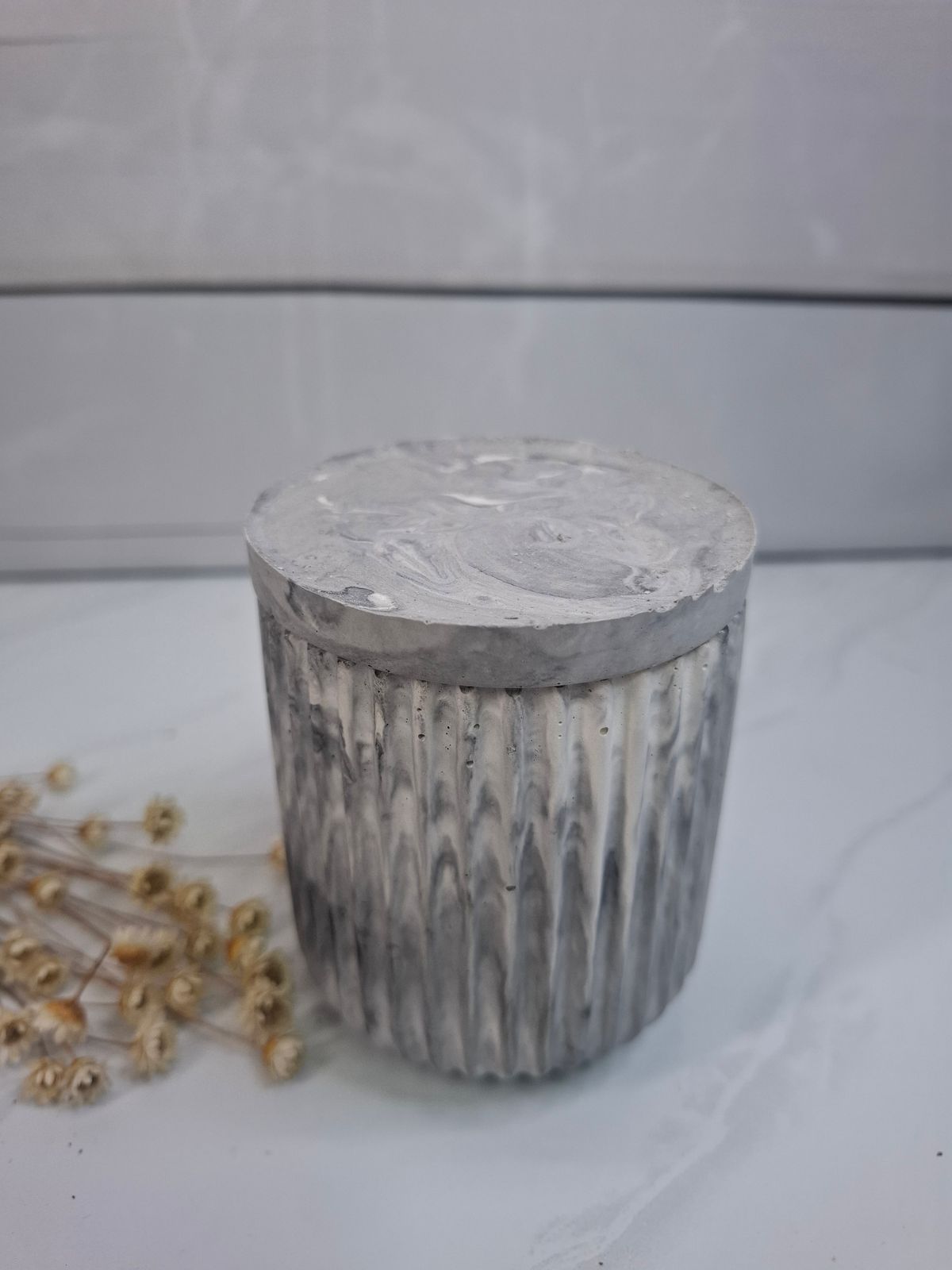Vela artesanal efecto mármol gris con tapa y mecha de madera
