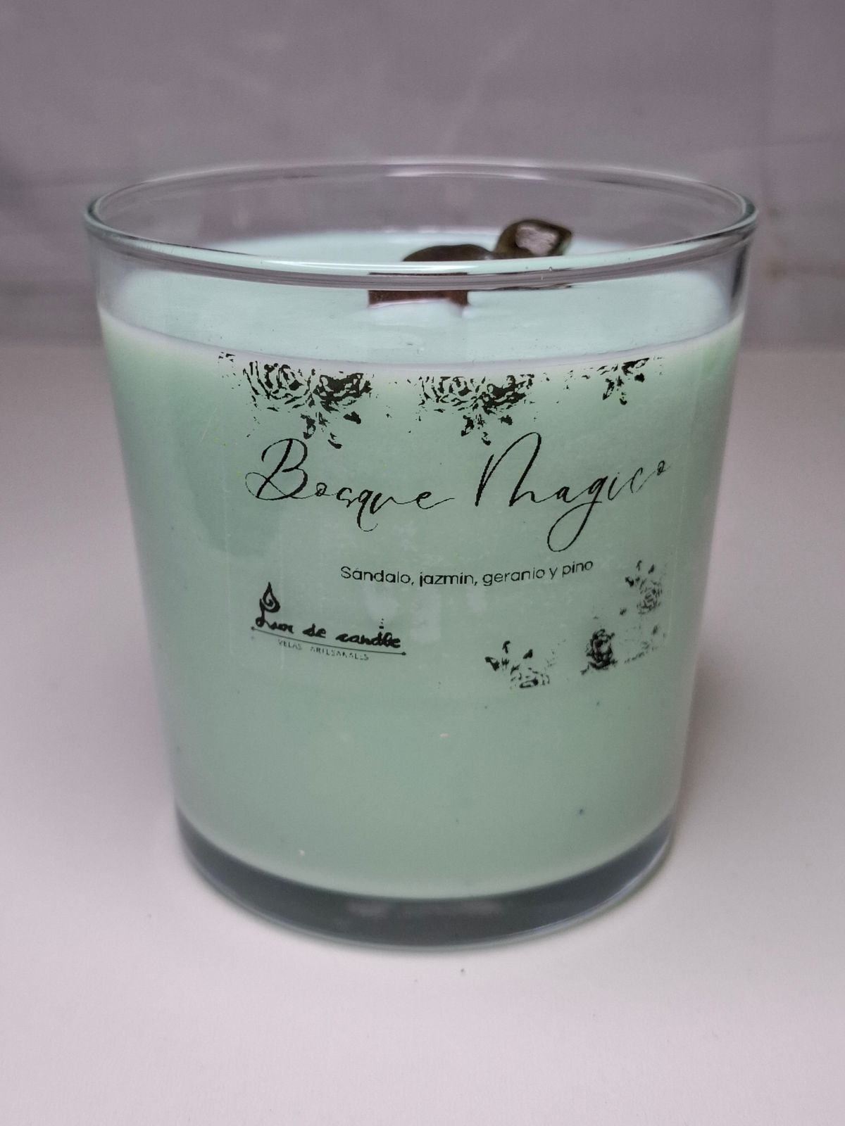 La vela "Bosque Mágico" está inspirada en la profundidad de los bosques encantados. Su aroma mezcla notas frescas y terrosas con un fondo amaderado y herbal que recuerda a paseos entre árboles antiguos y plantas silvestres.