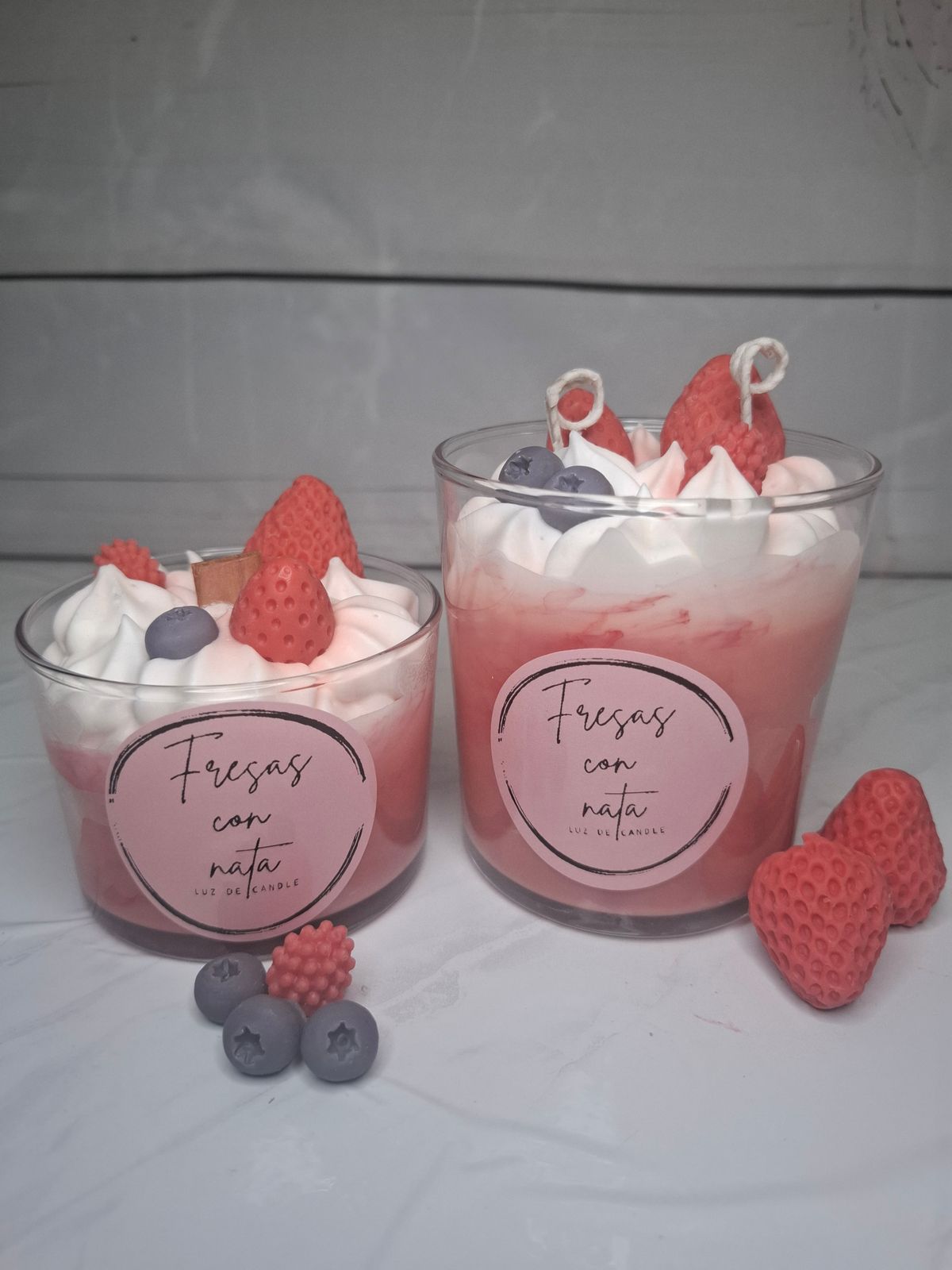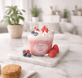 Disfruta de una experiencia visual y aromática con esta vela inspirada en un postre de fresas con nata. Elaborada con cera vegetal ecológica, está cuidadosamente decorada con elementos hiperrealistas: fresas, frambuesas y arándanos, todos esculpidos a mano en cera, sobre una base de nata batida también modelada.