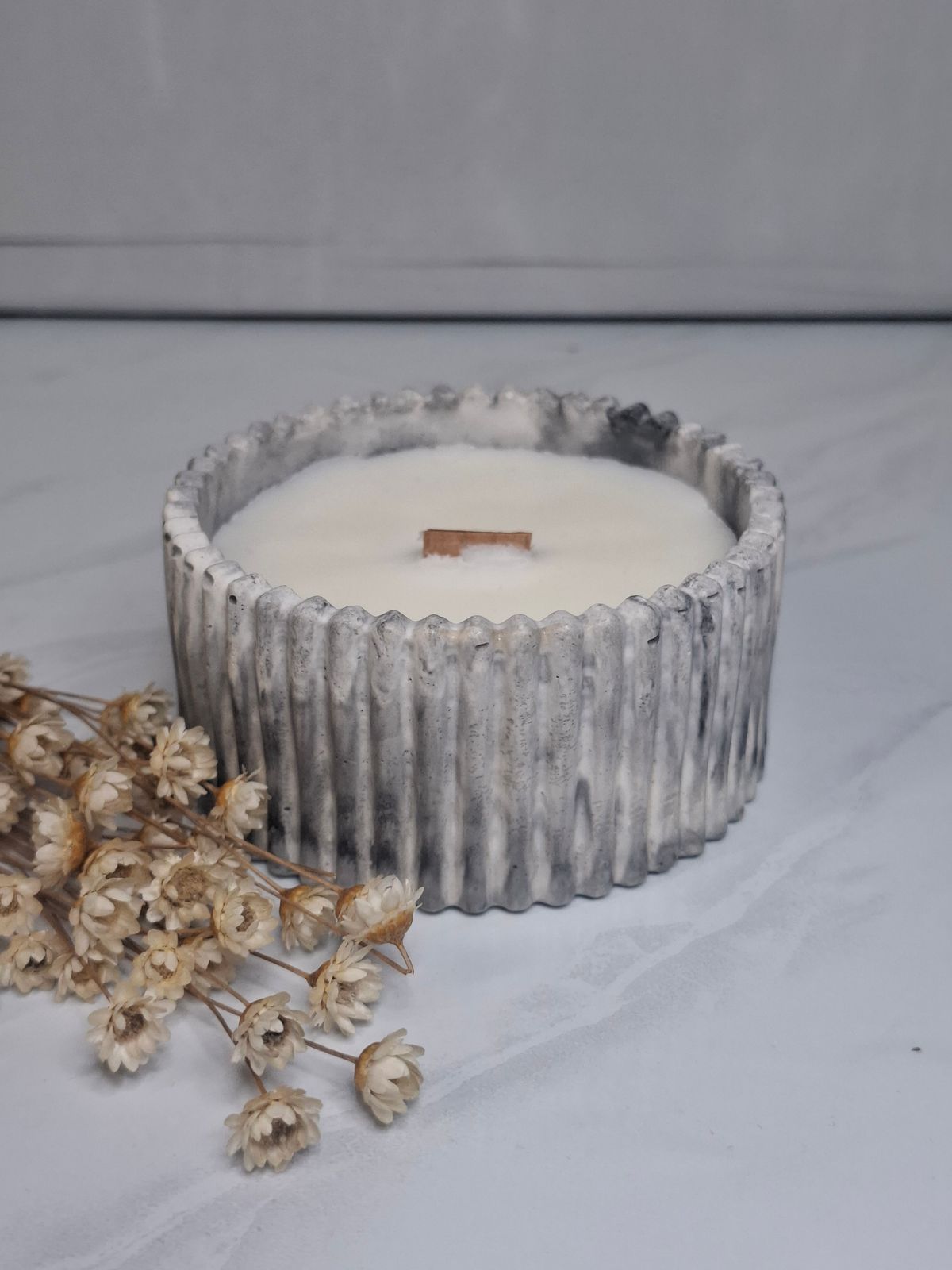 Una pieza minimalista y sofisticada que combina elegancia natural con un diseño moderno. Esta vela está elaborada a mano con cera vegetal ecológica y se presenta en un recipiente cilíndrico de cemento pigmentado con textura rayada vertical. Su acabado marmolado en tonos grisáceos oscuros le da una apariencia pétrea y atemporal, ideal para quienes aman la decoración de estilo nórdico, industrial o wabi-sabi. La mecha de madera no solo aporta un punto visual cálido y natural, sino que al encenderse produce un suave crepitar que convierte cualquier momento en una experiencia sensorial única.