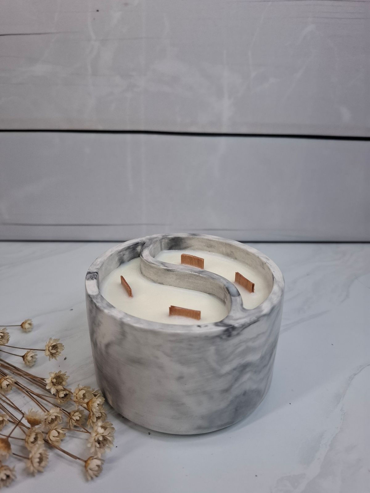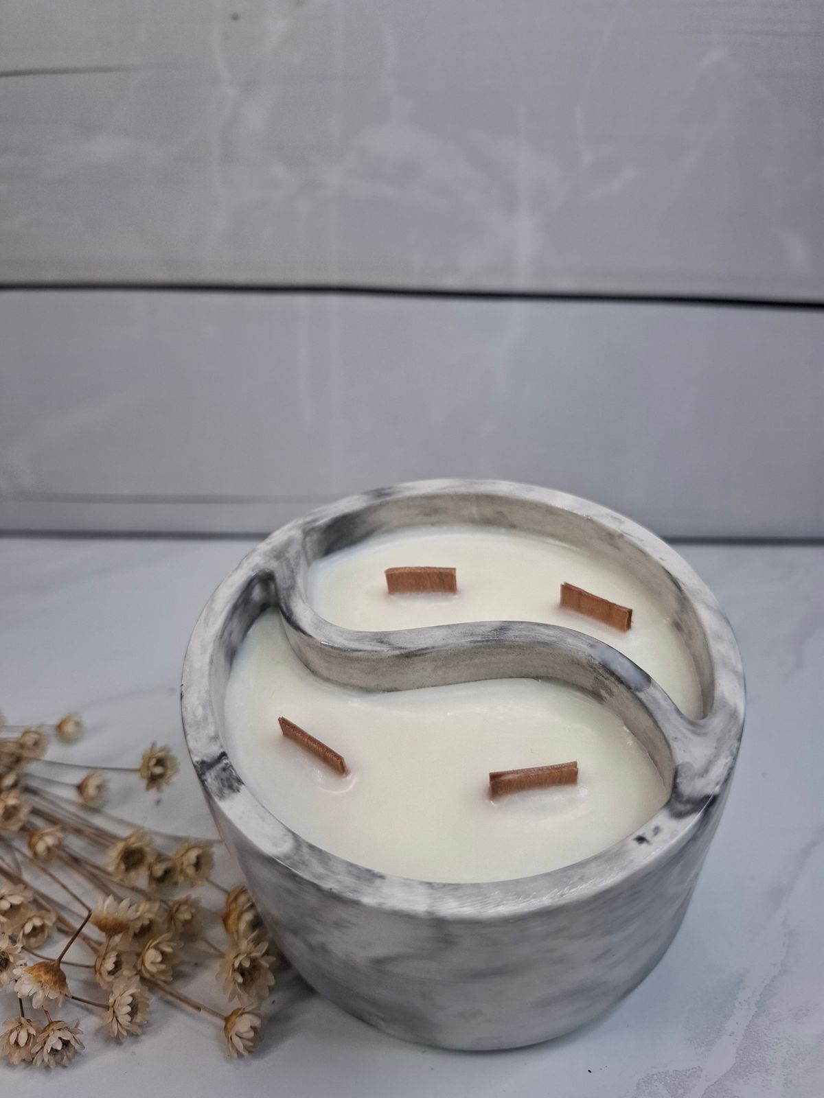 Vela Ying Yang efecto mármol artesanal con cera vegetal y mechas de madera